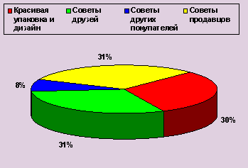 Рассмотрим эти группы факторов более внимательно и применительно к определенным товарам. Проанализируем первую группу факторов. 1. Абсолютно все потребители отметили, что им нужен качественный товар по приемлемой цене. Однако на практике цена играет самую решающую роль при покупке. 2. По этой причине отечественные тетради пользуются большим спросом, несмотря на более низкое качество и дизайн. Если же покупается тетрадь импортного производства, то потребитель более придирчиво относится к качеству бумаги и выбирает рисунок обложки. 3. То же учитывалось при покупке блокнотов, альбомов для рисования и сменных блоков. 4. Что касается дневников, то в настоящее время появились новые дневники (с рисунком) , которые пользуются меньшим спросом. Такие дневники нравятся ученикам младших классов, а школьники постарше их игнорируют. В то же время для школьников младшего возраста дневники покупают родители, которые приобретают первые попавшиеся, либо привычные по оформлению дневники. Тетради для нот представлены далеко не во всех магазинах. А там, где они есть, пользуются плохим спросом, так как покупаются на год и, в отличие от дневников - далеко не каждым школьником. Качество обслуживания также играет большую роль. Покупателю необходимо получить достоверную, нужную информацию о выбранном товаре, ближе рассмотреть товар и обратиться к любезному, воспитанному продавцу, Рассмотрим вторую группу факторов, влияющих на покупку канцелярских товаров. 2. Конечно же, красивая упаковка привлекает к себе внимание любого покупателя, но на российском рынке канцелярских товаров ценовая политика складывается так, что не каждый может себе это позволить. Но этот вопрос относится скорее к отечественным производителям школьно-письменных принадлежностей. Наши потребители активно пользуются советами друзей, продавцов и других покупателей. Советами продавцов - в отношении самого товара и его качества; друзей - в отношении конкретного магазина. Так как в разных магазинах - разные цены (а это определяющий фактор покупки школьно-письменных принадлежностей) , то информацию о ценах потенциальные покупатели получают от друзей и знакомых. К советам других покупателей обращаются редко, и только в том случае, если аналогичный товар был куплен предыдущим покупателем. Далее приведен (Рисунок 3) , демонстрирующая степень влияния отмеченных выше факторов на покупку канцелярских товаров. Рисунок 3 Факторы, влияющие на покупку канцтоваров