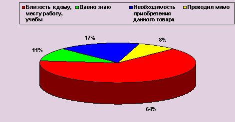 3. Как ни странно фактором, не оказавшим никакого влияния на покупку, стала реклама. Некоторые респонденты даже выражали свое удивление по поводу рекламы по отношению к канцелярским товарам (именно к школьно-письменным принадлежностям) . Они полагали, что люди идут за конкретной покупкой в конкретный магазин, о котором они уже имеют информацию, не понимая, что информацию, которую они получили об этом магазине - есть реклама. Их не интересует фирма-производитель, а интересует только цена. В основном покупки производятся по списку в начале учебного года или семестра. Использование калькулятора и купонов при покупке канцелярских товаров не характерно для нашего потребителя. Также респондентам было предложено назвать еще какие-либо факторы, влияющие на их решение о покупке (Рисунок 4) : Как следует из диаграммы для покупателей канцелярских товаров близость к дому, месту работы или учебы является весьма существенным фактором при покупке нужных им товаров. В анкете предполагались скрытые наблюдения за поведением потребителя при выборе товара. Но эта часть анкеты не была реализована в должной мере, так как на многие вопросы нельзя было ответить. Витрины наших магазинов не позволяют провести скрытое наблюдение за покупателями: все товары стоят в одном ряду и нельзя угадать на какой именно товар смотрит покупатель. Опрос проводился в ряде магазинов, которые отличаются местоположением и ассортиментом товара. Из предложенных нам для проведения исследования магазинов первым можно выделить Торговый Дом "Роспечать". Магазин находится на территории Тимирязевской Академии, что обеспечивает хороший спрос на данные товары. Пик покупок в магазине приходится на первую половину дня (с 10 до 13 час.) . Многие покупатели специально посещают этот магазин по советам друзей и личным впечатлениям, полученным ранее от посещения данного магазина. В этом магазине были самые приемлемые цены и квалифицированные продавцы, способные ответить на любой вопрос покупателя, по продаваемым товарам. Это подтверждается мнением респондентов: практически все отметили низкие цены продаваемых товаров, высокое качество обслуживания и большой ассортимент канцелярских товаров. Клиенты этого магазина уверены, что в нужный момент они купят нужный товар по низкой цене. Поэтому магазин имеет постоянную клиентуру, складывающуюся годами. Рисунок 4. Факторы, влияющие на решение респондентов о покупке