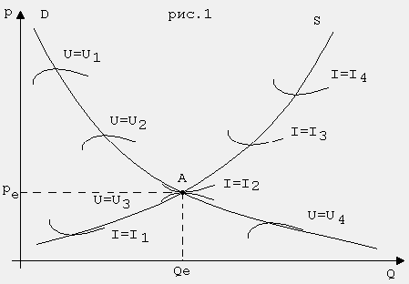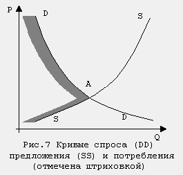 в случае, когда потребитель предъявляет спрос на определенный товар, исходя из своих предпочтений и бюджетных ограничений. Причем если может изменяться только цена товара, а все остальные факторы, от которых зависит спрос на него (цены других товаров, денежный доход, накопленные сбережения и т.п.) , остаются неизменными. Характерная особенность этой функции — ее монотонное убывание для многих видов товаров, при этом ее график (кривая D на рисунке 1) представляет собой геометрическое место точек на плоскости Q0p, в которых цена принимает максимально возможное значение на линиях постоянной полезности. Функции спроса и предложения являются основными составляющими модели рынка товаров, поскольку они — по предположению — представляют собой решения оптимизационных задач, которые возникают перед участниками (“покупателями и “товаропроизводителями” ) . Пересечение графиков спроса и предложения происходит в точке равновесия (точка А на рис. 1) , а соответствующая этой точке цена p=pe называется равновесной. Если цена на рынке выше равновесной, то предложение превышает спрос и возникает затоваривание. В этой ситуации товаропроизводители (продавцы) многих видов товаров готовы пойти на снижение цены с целью привлечения большего числа покупателей (например, если речь идет о скоропортящихся товарах) . Следовательно, при значениях цены выше равновесной происходит давление на нее в сторону уменьшения. Если же цена на рынке ниже равновесной, то спрос превышает предложение, и товар становится дефицитным. В этой ситуации часть покупателей готова заплатить за товар более высокую цену, но снизить риск и с уверенностью приобрести товар (например, если образуется очередь покупателей, то стоящие в ее конце могут не получить товара) . Таким образом, при значениях цены ниже равновесной происходит давление на нее в сторону увеличения. Эти две тенденции приводят к тому, что на рынках многих видов товаров, как правило, устанавливается равновесие, при котором спрос равен предложению. В силу свойств кривых спроса и предложения равновесное решение является устойчивым в том смысле, что если цена строго фиксирована и равна равновесной P=P e , то товаропроизводитель, максимизируя прибыль, поставляет на рынок товар в количестве S (p e ) =Q e ; одновременно потребитель, стремясь максимизировать полезность, предъявляет спрос D (p e ) =Q e . При установлении на рынке совершенной конкуренции равновесной цены объем товаров, предлагаемый товаропроизводителем и доставляющий ему максимум прибыли по данной цене, в точности равен спросу потребителя. Динамические неравновесные модели рынка используются для анализа изменения переменных (цена, спрос, предложение) во времени в случае, когда цена в начальный момент отличается от равновесной. При этом процесс установления равновесной цены может быть описан различными моделями при использовании одних и тех же функций спроса (2) и предложения (1) . Различают два подхода — непрерывный, в котором динамика цен описывается дифференциальным уравнением dp/dt = a (D (P) -S (p) ) , и дискретный, когда переменные на промежутке времени [t, t+1) принимаются неизменными. В последнем случае последовательным интервалам времени [t, t+1) соответствуют значения цены p t , спроса D t и предложения S t . В зависимости от используемых гипотез в дискретной модели динами