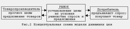 Концептуальная модель любого процесса динамики цен включает взаимодействие трех подсистем, которые можно условно назвать “товаропроизводитель” , “потребитель” и “рынок” (рис. 2) . Паутинообразная модель (модель А ) , в которой спрос отстает от предложения на один период: D (P t+1 ) =S (P t ) , также вписывается в схему рис. 2. Эта модель — одна из исторически первых динамических моделей рынка, отражающих поведение участников. Она служит хорошей иллюстрацией применения метода моделирования при анализе экономических процессов. Значение модели А определяется еще и тем, что многие современные модели динамики цен, а также динамические модели макроэкономики приводят к “паутинообразному” процессу. Рассмотрим гипотезы, которые лежат в основе этой модели. Гипотеза 1. Товаропроизводитель, принимая решение об объеме предложения, ориентируется на цену предыдущего периода. Эта гипотеза означает, что товаропроизводитель прогнозирует цену следующего периода. Правда, прогноз здесь очень примитивный, опирается на логическую схему: “сегодня цена была P t , если и завтра она будет равна P t , то я получу максимальную выгоду при продаже товара в количестве S (P t ) ” . Гипотеза 2. Рынок всегда находится в состоянии локального равновесия . Эту гипотезу можно трактовать, по Вальрасу, следующим образом. Вместо абстрактного, неодушевленного понятия “рынок” последний выступает в виде некоего человека-аукциониста, распоряжающегося на реальном рынке. Этот аукционист сначала устанавливает произвольные цены на товары, после чего участники рынка совершают условные сделки и сообщают об их результате аукционисту. Если спрос на некоторый товар оказался больше (меньше) предложения, то аукционист меняет первоначальные цены, поднимая (понижая) цену этого товара. Окончательные сделки совершаются лишь после достижения равновесия. Другая трактовка этой гипотезы состоит в том, что задачей аукциониста является установление максимальной цены, при которой весь товар, поставляемый на рынок производителем, находит покупателя. Формально эти две гипотезы означают следующее: 1) объем предложения на рынке S t+1 в каждый период времени t+1 определяется значением цены предыдущего периода при помощи функции предложения S t+1 =S (P t ) ;