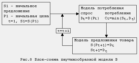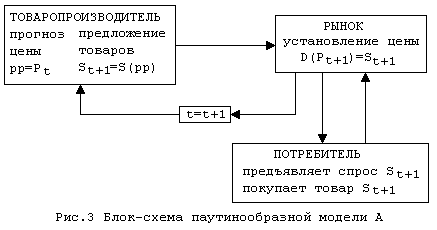 2) на рынке в каждый период t+1 устанавливается равновесная цена P t+1 , причем эта цена является решением уравнения D (P t+1 ) =S t+1 ; 3) потребитель предъявляет спрос, который при цене P t+1 в каждый момент времени равен предложению S t+1 , вследствие чего потребитель приобретает все, что ему предложено. Принятое в модели А взаимодействие подсистем “потребитель” , “товаропроизводитель” и “рынок” может быть представлено в виде блок-схемы, изображенной на рис. 3. Использование монотонных функций спроса и предложения позволяет построить последовательность цен P t , где t — номер шага во времени. Действительно, в силу гипотезы (1) товаропроизводитель по значению цены P 1 при помощи кривой предложения определяет S 2 ; в силу гипотезы (2) на рынке устанавливается цена P 2 (находится при помощи кривой спроса) ; в силу гипотезы (3) весь товар в количестве S 2 находит потребителя; в силу гипотезы (1) товаропроизводитель, ориентируясь на цену P 2 , определяет объем предложения S 3 и т.д. (рис. 3) . Далее рассмотренный процесс повторяется.