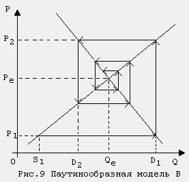 Если же s<d, то в этом случае колебания цен увеличиваются, а при s=d, как и в модели А , происходит колебание цен с постоянной амплитудой. Как видим, изменение гипотез модели А привело не только к смене направления “наматывая” спирали, но, следовательно, и к изменению условия сходимости итерационного процесса на противоположное. Итак, если итерационный процесс динамики цен в одной из рассмотренных моделей ( А или В ) сходится, то в другой — расходится.