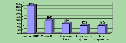 График 1 . Удельный вес валют в корзине СДР. (данные на 1981 г.) Государствам-членам МВФ было предложено поддерживать курсы национальных валют одной из следующих схем: