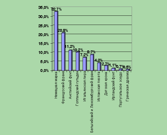 Основой ЕВС считается Европейская Валютная Единица ЭКЮ (ECU - European Currency Unit) . Собственно, ЭКЮ не явилось принципиально новым элементом, т.к. до этого с середины 70-х гг. в ЕЭС уже существовала Европейская Расчетная Единица (ЕРЕ) , которая сначала была приравнена к 0,888671 г чистого золота, а с 1975 года стала определяться через корзину валют. Именно эта “стандартная корзина” и легла в основу введения ЭКЮ, которому прочилось большое будущее в рамках ЕЭС, а потом и за его пределами. Примерный состав “корзины” ЭКЮ показан на Графике 2 . На данный момент данные могут несколько измениться, т.к. идет постоянный пересмотр квот стран-участниц ЕВС.