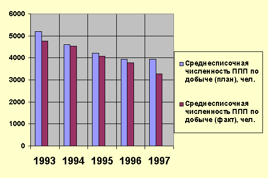 T t – среднесписочная численность работников в t –м году, чел., Д сдt - среднесуточная добыча угля в t –м году, тонн. 1993 год T 93ППП (план) = (5200/2153) · 1000=2415,23 чел. на 1000 тонн T 93ППП (факт) = (4774/2333) · 1000=2046,29 чел. на 1000 тонн 1994 год T 94ППП (план) = (4594/2175) · 1000=2112,18 чел. на 1000 тонн T 94ППП (факт) = (4524/1801) · 1000=2511,94 чел. на 1000 тонн 1995 год T 95ППП (план) = (4207/1813) · 1000=2320,46 чел. на 1000 тонн T 95ППП (факт) = (4073/1618) · 1000=2517,30 чел. на 1000 тонн 1996 год T 96ППП (план) = (3950/1740) · 1000=2270,11 чел. на 1000 тонн T 96ППП (факт) = (3778/1382) · 1000=2733,72 чел. на 1000 тонн 1997 год T 97ППП (план) = (3950/1834) · 1000=2153,76 чел. на 1000 тонн T 97ППП (факт) = (3271/1333) · 1000=2453,86 чел. на 1000 тонн