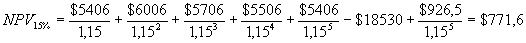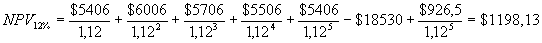 Данный показатель сравнивается с коэффициентом рентабельности авансированного капитала, рассчитываемого делением общей чистой прибыли предприятия на общую сумму средств, авансированных в его деятельность (итог среднего баланса-нетто) . Метод, основанный на коэффициенте эффективности инвестиции, также имеет ряд существенных недостатков, обусловленных в основном тем, что он не учитывает временной составляющей денежных потоков. В частности, метод не делает различия между проектами с одинаковой суммой среднегодовой прибыли, но варьирующей суммой прибыли по годам, а также между проектами, имеющими одинаковую среднегодовую прибыль, но генерируемую в течение различного количества лет. и т.п. 2. Обоснование экономической целесообразности инвестиций по проекту. 2.1. Исходные данные. На основании изучения рынка продукции, которая производится на предприятии, установлена возможность увеличения платежеспособного спроса на неё. В связи с этим предприятие рассматривает целесообразность приобретения новой технологической линии для увеличения производства продукции с целью увеличения объема продаж. Оценка возможного увеличения объёма продаж установлена на основании анализа данных о потенциальных возможностях конкурентов. Стоимость линии (капитальные вложения по проекту) составляет $18530; срок эксплуатации - 5 лет; прибыль за вычетом налога на нее от реализации основных фондов по истечении срока их службы составит $926.5;. денежные потоки (прибыль за вычетом налога на нее и амортизационных отчислений от стоимости введенных в действие основных фондов за счет капитальных вложений) прогнозируется по годам в следующих объемах: $5406, $6006, $5706, $5506, $5406. Ставка дисконта для определения теперешней стоимости денежных потоков принята в размере 12% и 15%. Граничная ставка для оценки расчетного уровня внутренней ставки дохода установлена в размере 16%. Приемлемый для предприятия период окупаемости капитальных вложений, исчисленный по данным о денежных потоках и теперешней стоимости денежных потоков принят 5 лет. Целесообразен ли данный проект к реализации? 2.2. Определение теперешней чистой стоимости а) При ставке дисконта 12%.