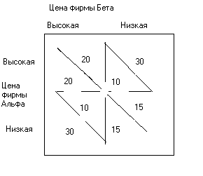 Сговор и соперничество в олигополии Поведение олигополии всегда определяется двумя силами, действующими в противоположных направлениях. Первая сила — это простая заинтересованность фирм в максимизации совокупной прибыли отрасли посредством сговора и совместных действий фирм, как если бы они были единственным максимизирующим прибыль монополистом. Сговор — это явное или молчаливое соглашение между фирмами в отрасли с целью установления фиксированных цен и объемов выпуска или же в целях ограничения каким-то иным способом соперничества между ними. Явный сговор подразумевает фактическое соглашение между фирмами в отрасли, тогда как молчаливей сговор основывается на взаимопонимании без слов. Олигополисты вовлекаются в соперничество, когда они предпринимают попытки отнять дело друг у друга. Сговором не исчерпываются все формы соперничества. Например, участвующие в сговоре фирмы могут прийти к соглашению о цене, которую все они назначат, но не ограничивать расходы на рекламу или представление новых изделий. В Соединенных Штатах явный сговор почти всегда является противозаконным, тогда как молчаливый сговор, как правило, законом не преследуется. Вторая сила, влияющая на поведение олигополиста, — это эгоистическая заинтересованность каждого продавца в максимизации своих собственных прибылей, даже если в результате этого уменьшается общая величина прибыли отрасли. Большой кусок от маленького пирога, возможно, лучше, чем маленький кусок от большого пирога. Сговаривающиеся олигополисты будут вести себя подобно монополисту и, следовательно, устанавливают монопольную цену, превышающую величину предельных издержек. Но в этом случае каждая отдельная фирма имела бы возможность значительно увеличить свои прибыли, если бы она могла нарушить соглашение при помощи обмана немного снижая свою цену и отбирая тем самым существенную часть бизнеса у своих соперников. Однако если все фирмы, соперничая друг с другом будут снижать цены, то рыночная цена упадет и всем продавцам будет хуже, чем было при сговоре, хотя, и покупатели, и общество в целом от этого только выиграют. | Таким образом, возможность совместных действий в целях максимизации общей величины прибыли в отрасли, приводит олигополистов к попытке сговора. Если им это удастся, то отрасль будет напоминать монополию. Однако возможность для каждого продавца увеличить свою долю в отраслевой прибыли с помощью не основанного на сговоре, но предполагающего соперничество поведения может привести некоторые фирмы к отказу от сговора или вынудить их разорвать договорные соглашения. Если все фирмы ведут себя независимо, т.е. не сговариваются друг с другом, то все они будут получать более низкие прибыли, а рыночная цена упадет до конкурентного уровня. Дилема олигополистов Рисунок 1 помогает понять, почему сговор является трудным делом. На нем представлена следующая ситуация. Две фирмы, “Альфа” и “Бета” , являются единственными продавцами на рынке. Каждая может установить или высокую, или низкую цену. Если обе фирмы устанавливают высокую, монопольную цену, то каждая получит сверхприбыль в размере 20 млн. долл., тогда как если обе устанавливают низкие цены, прибыли каждой составят только 15 млн. долл. Таким образом, в данной ситуации имеется побудительный мотив к сговору, но также и с