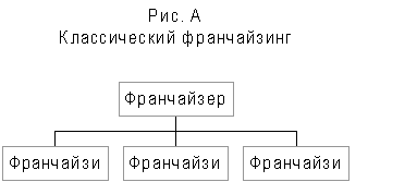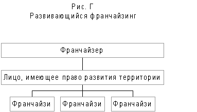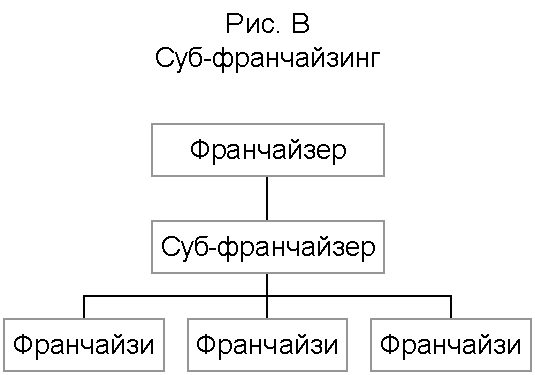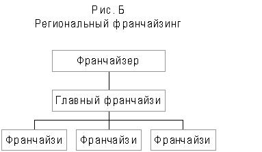 В последние годы классическая модель франчайзинга (рис. А) изменилась в направлении обеспечения франчайзера дополнительными возможностями быстрого развития с наименьшими затратами. Хотя существует много вариантов классического франчайзинга, три из них наиболее часто используются. Это: региональный франчайзинг, суб–франчайзинг, развивающийся франчайзинг дополнительными возможностями быстрого развития с наименьшими затратами. Хотя существует много вариантов классического франчайзинга, три из них наиболее часто используются. Это: региональный франчайзинг; суб–франчайзинг; развивающийся франчайзинг (рис. Б, В, Г) . В каждом из этих случаев франчайзи получает все преимущества, которые обычно связаны с франчайзингом: использование торговой марки и логотипа франчайзера, системы его бизнеса, первоначальное обучение, выбор места, поддержка и т.д. Основные отличия их друг от друга заключаются в следующих характеристиках: