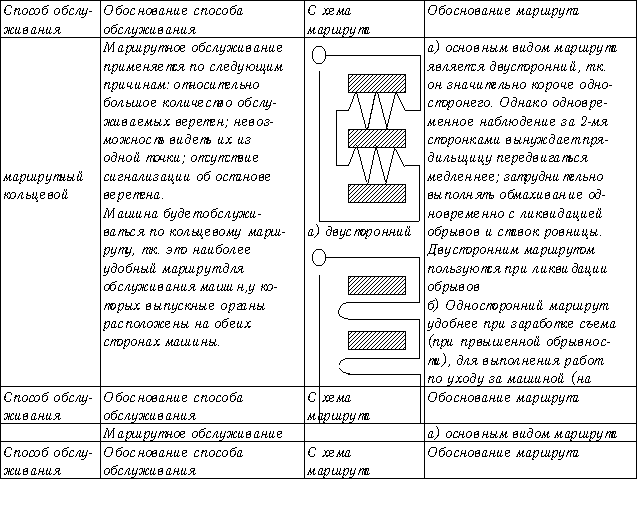 1.5.2. Планирование работ Помимо того, что прядильщица должна владеть передовыми рабочими приемами, она должна уметь планировать свою работу планирование работ включает в себя решение следующих вопросов. I) ВЫБОР СПОСОБА ОБСЛУЖИВАНИЯ ОБОРУДОВАНИЯ Обычно прядильщица применяет маршрутный кольцевой способ обслуживания, при котором за один обход обслуживаемого участка выполняет все необходимые работы. Важной целью планирования является максимально возможное сокращение длительности обхода, т.к. от этого зависит длительность перерывов из-за совпадения. Сокращению длительности обхода способствует правильно выбранный маршрут и быстрое и точное выполнение рабочих приемов. Схему маршрута и его обоснование приведены в таблице 1.7. Таблица 1.7. Способ обслуживания и его обоснование