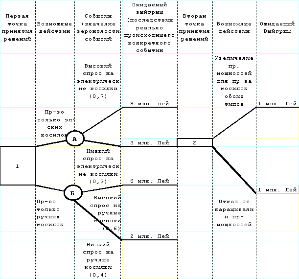 Введение Принятие решений – основная часть работы менеджеров любого звена любого предприятия. Поэтому понимание всех тонкостей процесса принятия решений в различных условиях, знание и применение различных методов и моделей принятия решений играет значительную роль в повышении эффективности работы управленческого персонала. В данной работе автор попытается рассмотреть понятия, связанные с принятием решений в различных условиях. Такие, например, как “риск” , “определенность” , “неопределенность” . Будут рассмотрены некоторые примеры принятия решений в условиях определенности, риска и неопределенности. Также будут рассмотрены некоторые методы и модели принятия решений. Кроме того, автор предпримет попытку анализа ситуации в сфере принятия решений в молдавском бизнесе на данном этапе его развития и сложившейся в нашем обществе ситуации. В нашей стране долгое время проблеме обучения управленческого персонала не уделялось должного внимания. Это происходило потому, что в административно-командной системе основные решения принимались на уровне министерств и ведомств. На более низком уровне эти решения только претворялись в жизнь. Также на более низком уровне принимались тактические решения, которые также контролировались вышестоящими органами. В условиях перехода к рыночной экономике существенно увеличивается ответственность при принятии решений руководителей всех уровней. Это связано с тем, что каждое решение может повлиять на положение данной конкретной организации, и нет вышестоящих органов, разрабатывающих и контролирующих принятие стратегических решений. Поэтому рассмотрение данной проблемы очень актуально. 1.1 Теоретические определения. 1.1.1 Решение Процесс принятия решений для каждого человека индивидуален, очень сложен и мало кто может его избежать. Способность принимать решения быстро и правильно вырабатывается с опытом. Различные специалисты дают различные определения понятию “решение” , но из всех определений следует, что Решение – это выбор альтернативы К решениям относятся совершенно различные выборы, совершаемые нами повседневной жизни: выбор одежды, меню и так далее. Некоторые принимаются нами абсолютно машинально, без долгого и систематического обдумывания, рассмотрения всех альтернатив. Однако и в повседневной жизни есть решения, над принятием которых мы размышляем часы, дни, месяцы и годы. В управлении принятие решений – более систематизированный процесс, чем в частной жизни. Это связано с много большей ответственностью. Менеджеры принимают решения, связанные со многими людьми и с большой материальной ответственностью. Поэтому они не могут принимать непродуманных решений. Решения, принимаемые руководителем для выполнения обязанностей, обусловленных занимаемой должностью называют организационными решениями. Организационные решения квалифицируют как запрограммированные и незапрограммированные. Запрограммированным решением называют решение, принятое как результат реализации определенной последовательности действий или шагов, подобных тем, что принимаются при решении математического уравнения. Как правило, число возможных альтернатив ограничено, и выбор должен быть сделан в пределах направлений, заданных организацией. Незапрограммированные решения – решения, прин