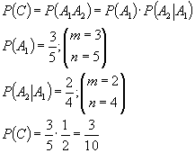 Задача на умножение вероятностей. В урне находится 3 белых и 2 черных шара. Вынимается по 2 шара. Найти вероятность того, что оба шара белые? А 1 - первый шар белый. А 2 - второй шар белый. А=А 1 А 2