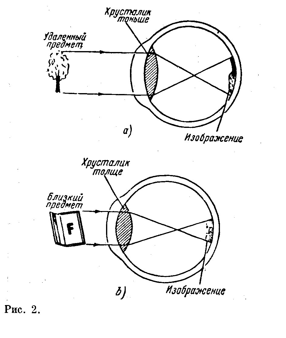 3. Фокусация глаз. В один момент нормальный глаз может дать одинаково чёткое изображение отпечатанного текста или спидометра автомашины, находящийся всего на расстоянии какого-нибудь десятка сантиметров от глаз, а в следующую долю секунды он способен сфокусировать чётко на сетчатой оболочке такой большой удалённый предмет как гора. Не обладай мы такой способностью, было бы очень сложно управлять быстроходными автомобиля и самолётами. Увеличилось бы количество несчастных случаев, которых и так много. Существует несколько теоретически возможных способов. Допусти, рыба фокусирует свой глаз, изменяя расстояние между линзой и сетчатой оболочкой так же, как и фокусируется фотоаппарат с растяжением. Но фокусировка человеческого глаза достигается не таким способом, хрусталик глаза изменяет свою форму, т. е. с увеличением расстояния предмета, приводящим к уменьшению расстояния изображения, мускулы, соединённые с внешними краями глазного хрусталика, заставляют хрусталик сплющиваться и он становится тоньше. Его фокусное расстояние увеличивается в достаточной степени, изображение резко фокусируется на сетчатой оболочке (рис 2.а). Когда предмет приближается к глазу, чтобы заставить увеличиться расстояние до изображения, хрусталик становится более выпуклым и толстым. Его фокусное расстояние при этом уменьшается так, что расстояние изображения остаётся полным и изображение не сходит с сетчатой оболочки (рис 2,в). Процесс называется аккомодацией и дает те же самые результаты, что и фокусировка фотоаппарата. Так как стенки фотоаппарата поглощают любой попавший луч света, его внутренность зачернена. Внутренность глаза так же окружена тёмной оболочкой, которая поглощает свет. Поверх тёмной имеется твёрдая белая оболочка глаза, сохраняющая форму глазного яблока. Она защищает глаз от повреждений. Глаз во многом совершеннее фотоаппарата, но не во всем. Например, фотоаппарат даёт стационарное изображение предметов во всех подробностях, между тем как изображение в глазу существует только в течение 1/16 сек до появления следующего чёткого изображения. На сетчатой оболочке часто одно изображение может перекрываться и заслонять следующее изображение, отсутствуют некоторые детали. Поэтому два болельщика могут спорить относительно победителя в гонках. Фотоснимки не имеют таких недостатков. При таких обстоятельствах имеют они превосходство перед непосредственным наблюдателем. Остаточное изображение в глазу вызывает размытие картины спиц вращающегося колеса, а также создаёт видимость светящегося следа за быстродвижущимся в темноте источником света. На самом деле в кино мы видим от 16 до 24 неподвижных картин, чередующихся на экране каждую секунду. После каждой такой картины и перед следующей экран затемняется обтюратором кинопроекционного аппарата, но глаз сохраняет впечатление непрерывного изображения.