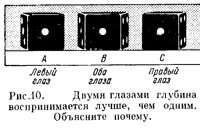 Бинокулярное зрение можно иллюстрировать, расположив небольшой кусок картона перпендикулярно к рис. 9 вдоль его средней линии и приложив нос к верхнему ребру картона, так что каждый глаз будет видеть только половину всего рисунка. В результате этого вы увидите одно трёхмерное изображение, имеющее не только длину и ширину, но и глубину. Другой хорошей иллюстрацией бинокулярного зрения являются старинный стереоскоп. Два изображения одного и того же предмета снимаются одновременно двумя фотоаппаратами, расположенными на расстоянии нескольких сантиметров друг от друга, и готовые фотографии наклеиваются рядом на куске картона. Этот картон вставляется в стереоскоп так, что каждая из фотографий оказывается перед призмой и положительной линзой и каждый глаз видит только одну из фотографий. Призмы позволяют слить два изображения, а положительные линзы несколько увеличивают фотографии. В результате обе фотографии представляются в виде одного трёхмерного изображения, обладающего глубиной и всеми свойствами натуры. Левое изображение изображает несколько большую часть левой стороны трёхмерного тела, а правое изображение – несколько большую часть правой стороны это создает видимость глубины. Возможно также, что на той или иной фотографии может получиться несколько большая часть верхней или нижней стороны предмета. Эффект глубины получается при слиянии этих двух слегка различающихся изображений.