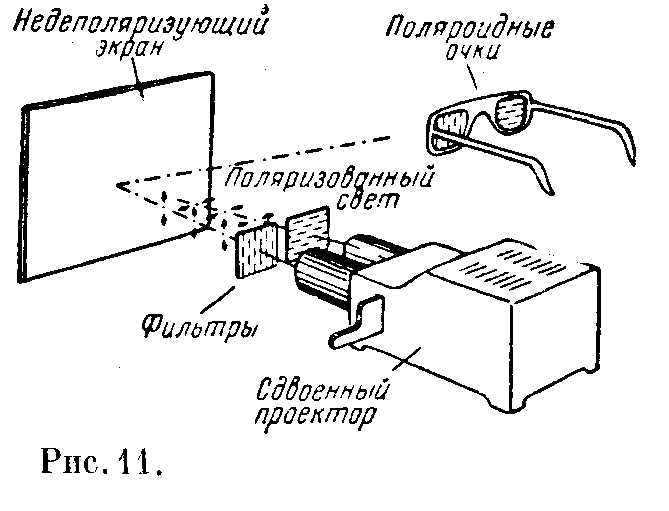 11. Трёхмерное кино и бинокулярное зрение. Развитием принципов бинокулярного зрения и методов стереоскопической фотографии является трёхмерное кино. Вместо одного изображения каждой сцены, как это имеет место в обычной кинематографии, снимаются две фотографии, двумя различными камерами, расположенными на расстояние нескольких сантиметров друг от друга. Обе фотографии проецируются одновременно на экран двумя различными проекторами, где проекторы поляризуют свет так, что плоскость поляризации одного проектора перпендикулярна к плоскости поляризации другого. Если смотреть на экран через поляроидные очки( рис. 11), то один глаз видит одно изображение на экране, а другой – другое. В итоге оба изображения сливаются в мозгу в одно трехмерное. 12. Способность оценивать расстояние и видеть вбок. Чтобы иметь успех во многих видах спорта и в других видах деятельности, где требуется большая острота зрения. Нужно уметь оценить расстояние и глубину, ни и в это же время видеть обоими глазами по сторонам.