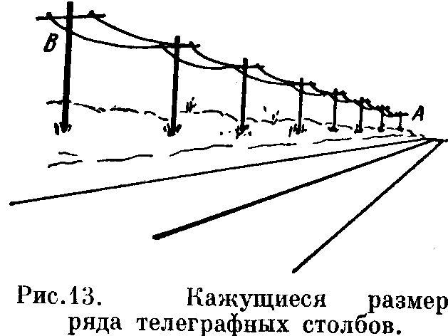 13. Различные способы оценки расстояния. Оценка расстояния идет разными способами. На рис. 13 изображен длинный ряд телеграфных столбов, уходящий вдаль. В действительности все столбы находятся на одном и том же расстоянии от точки наблюдения. Секрет такой иллюзии состоит в том, что по мере увеличения расстояния предмета от глаза, уменьшается размер его изображения. На рис. 13 самый маленький на рисунке столб представляется наиболее удаленным, он