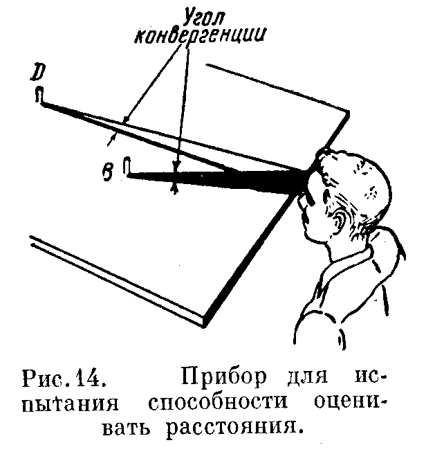 При смотрении обоими глазами в одну и ту же точку D, как показано на рис. 14, необходимо некоторое мускульное усилие для того, чтобы свести оба глаза внутрь это может послужить одной из причин, почему мы можем лучше оценивать расстояние обоими глазами, чем одним. Глаза расположены на некотором расстоянии друг от друга, и мы на опыте научаемся оценивать расстояние до точки D по мускульному усилию, необходимому для сведения (конвергенции) глаз. Чтобы иметь возможность увидеть ещё более близкую точку B, приходится употребить большее мускульное усилие для сосредоточения обоих глаз в точке В. В военном деле употребляются дальномеры, которые действуют примерно так же. Две зрительные трубы находятся на определенном расстоянии друг от друга - база дальномера. Каждая из труб фокусируется на некоторый удалённый предмет, причем чем меньше угол, который образуется осями обоих труб, тем больше расстояние до этого предмета. 14. Несогласование напряжёния мускулов. Существует также такой недостаток зрения, при котором оба изображения фокусируются не на соответствующих частях обеих сетчатых оболочек. При таком дефекте зрения возникает двойное изображение. Результат в более легких случаях неправильности в бинокулярном зрении. Этот недостаток объясняется тем, что мускулы обоих глаз работают не так, как они должны были бы работать, а не согласованно, т. е. мускулы не уравновешенны. При помощи старинного стереоскопа, можно провести грубое испытание уравновешенности глазных мускулов. На рис. 9 изображена простая карта, которая вставляется в стереоскоп для проведения испытания. Шар для нормальных глаз должен находиться приблизительно в середине начерченной прямой, между отметками 4 и 6 через центр кружка должна проходить эта линия.