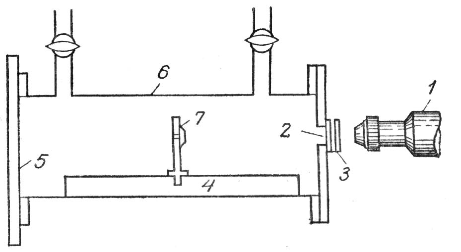 Его устройство заключается в том, что латунная трубка 6 длиной 20 см с двумя кранами наполняется газом. Внутри нее находится диск радиоактивного излучателя 7, испускающего частицы. Диск этот укреплен на стойке, двигающейся по рельсу 4. Во время опыта один конец трубки закрывается матовой стеклянной пластинкой, а другой конец – стеклянной пластинкой, прикрепляемой воском. Маленькое прямоугольное отверстие в латунной пластинке закрывалось серебряной пластинкой 3, которая обладала способностью задерживать частицы, аналогичные слою воздуха толщиной примерно 5 см. Против отверстия помещался люминесцирующий экран из цинковой обманки. Для счета сцинтилляций исследователь пользовался зрительной трубой 1.