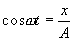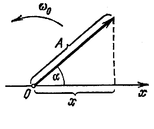 2). Из взятой на оси некоторой точки О отложим направленный отрезок - вектор длины A, образующий с осью угол некоторый α . 3). Вращая вектор А вокруг точки О с угловой скоростью ω 0 , получим, что проекция конца вектора на ось будет совершать гармонические колебания с амплитудой, равной длине вектора, с круговой частотой, равной угловой скорости вращения вектора, и с начальной фазой, равной углу, образуемому вектором с осью в начальный момент времени: проекция конца вектора будет перемещаться по оси x, принимая значения от - А до + A , а координата этой проекции будет изменяться со временем по закону