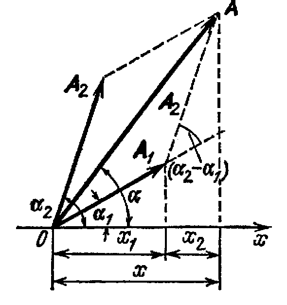 Вектор A вращается с той же угловой скоростью ω 0 , как и векторы А 1 и А 2 , так что сумма x 1 и х 2 является гармоническим колебанием с частотой (ω 0 , амплитудой A и начальной фазой α . Используя теорему косинусов получаем, что