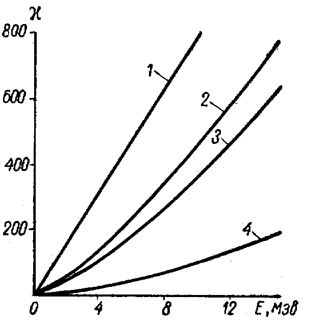 Органические кристаллические сцинтилляторы. Для регистрации ядерных излучений наибольшее распространение получили следующие органические кристаллы: антрацен, стильбен, нафталин. Антрацен обладает достаточно большим световым выходом (~4%) и малым временем высвечивания (3•10 -8 сек). Но при регистрации тяжелых заряженных частиц линейная зависимость интенсивности сцинтилляции наблюдается лишь при довольно больших энергиях частиц. Стильбен хотя и обладает несколько меньшим световым выходом, чем антрацен, но зато длительность сцинтилляции у него значительно меньше (7•10 -9 сек), чем у антрацена, что позволяет использовать его в тех экспериментах, где требуется регистрация очень интенсивного излучения. Так как по сравнению с силами, действующими в неорганических кристаллах молекулярные силы связи в органических кристаллах малы, взаимодействующие молекулы практически не возмущают энергетические электронные уровни друг у друга и процесс люминесценции органического кристалла является процессом, характерным для отдельных молекул. В основном электронном состоянии молекула имеет несколько колебательных уровней. Под воздействием регистрируемого излучения молекула переходит в возбужденное электронное состояние, которому также соответствует несколько колебательных уровней. Также возможны ионизация и диссоциация молекул. В результате рекомбинации ионизованной молекулы, она, как правило, образуется в возбужденном состоянии. Первоначально возбужденная молекула может находиться на высоких уровнях возбуждения и через короткое время (~10 -11 сек) испускает фотон высокой энергии, который поглощается другой молекулой, причем часть энергии возбуждения этой молекулы может быть израсходована на тепловое движение и испущенный впоследствии фотон будет обладать уже меньшей энергией по сравнению с предыдущим. После нескольких циклов испускания и поглощения образуются молекулы, находящиеся на первом возбужденном уровне, которые испускают фотоны, энергия которых может оказаться уже недостаточной для возбуждения других молекул и, таким образом, кристалл будет прозрачным для возникающего излучения. На рис. 2 приведены графики зависимости светового выхода c (в произвольных единицах) от энергии электронов 1, протонов 2 , дейтонов 3 и a -частиц 4 .