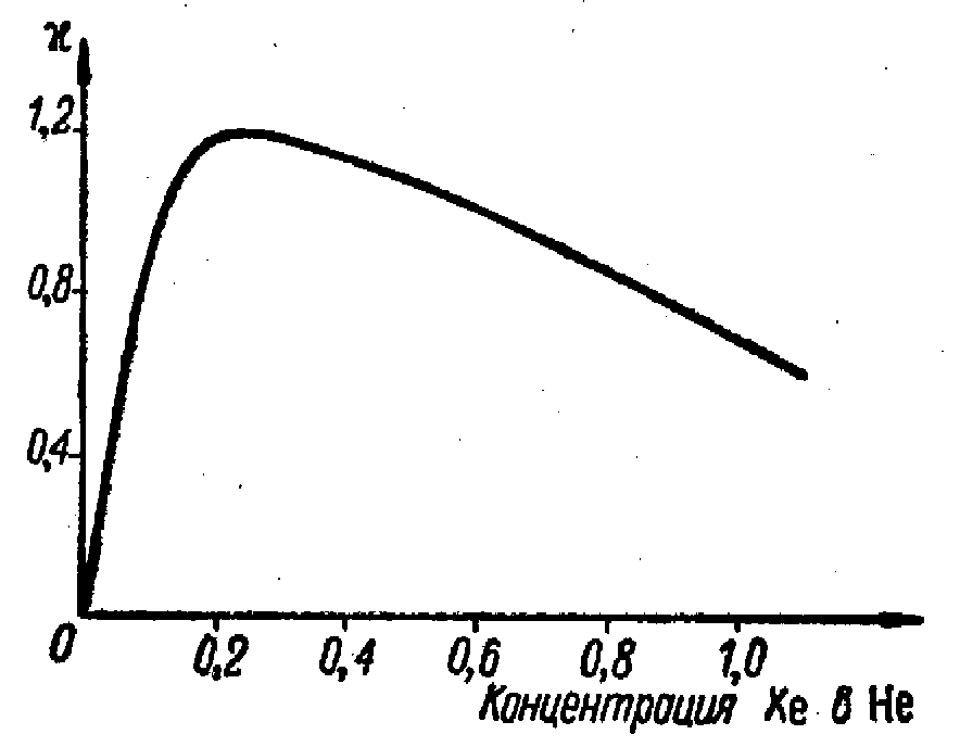 Появление сцинтилляций наблюдалось при прохождении заряженных частиц через различные газы. Газовые сцинтилляторы обладают малой чувствительностью к g -излучению. Наибольшим световым - выходом обладают тяжелые благородные газы (ксенон и криптон), а также смесь ксенона и гелия. Присутствие в гелии 10% ксенона обеспечивает световой выход, даже больший, чем у чистого ксенона (рис. 3). Ничтожно малые примеси других газов резко уменьшают интенсивность сцинтилляций в благородных газах.