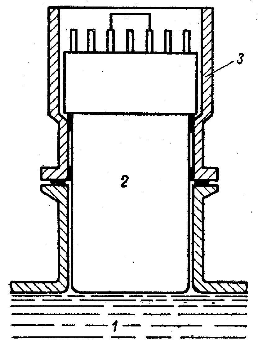 Рис. 6. Сочленение ФЭУ с жидким сцинтиллятором. 1—жидкий сцинтиллятор; 2— ФЭУ; 3— светозащитный кожух. При работе сцинтилляционного счетчика в импульсном режиме на выходе ФЭУ возникают короткие (~10 -8 сек) импульсы, амплитуда которых может составлять несколько единиц или несколько десятков вольт. При этом потенциалы на последних динодах могут испытывать резкие изменения, так как ток через делитель не успевает восполнить заряд, уносимый с каскада электронами. Чтобы избежать таких колебаний потенциалов, несколько последних сопротивлений делителя шунтируются емкостями. За счет подбора потенциалов на динодах создаются благоприятные условия для сбора электронов на этих динодах, т.е. осуществляется определенная электроннооптическая система, соответствующая оптимальному режиму. В электроннооптической системе траектория электрона не зависит от пропорционального изменения потенциалов на всех электродах, образующих данную электроннооптическую систему. Так и в умножителе при изменении напряжения питания изменяется лишь коэффициент усиления его, но электроннооптические свойства остаются неизменными. При непропорциональном изменении потенциалов на динодах ФЭУ условия фокусировки электронов на участке, где нарушена пропорциональность, изменяются. Это обстоятельство и используется для самостабилизации коэффициента усиления ФЭУ. Для этой цели потенциал