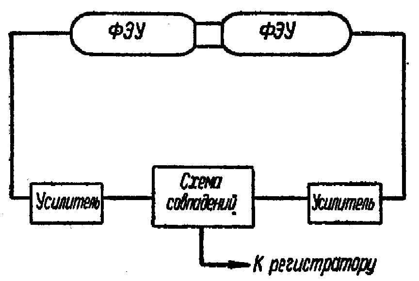 Рассмотрим следующий пример: Для регистрации импульсов с амплитуд, сравнимой с шумовыми импульсами, рационально использовать один сцинтиллятор с двумя ФЭУ, включенными в схему совпадений (рис. 5). Тогда происходит временная селекция импульсов, возникших от регистрируемой частицы - вспышка света, возникшая в сцинтилляторе от регистрируемой частицы, попадет одновременно на фтокатоды обоих ФЭУ, и на их выходе одновременно появятся импульсы, заставляющие сработать схему совпадений. Частица будет зарегистрирована. Шумовые же импульсы в каждом из ФЭУ появляются независимо друг от друга и чаще всего не будут зарегистрированы схемой совпадений. Такой способ позволяет уменьшать собственный фон ФЭУ на 2—3 порядка. Число шумовых импульсов зависит от величины приложенного напряжения, и ратёт с его ростом сначала довольно медленно, затем возрастание резко увеличивается. Причиной этого резкого возрастания фона является автоэлектронная эмиссия с острых краев электродов и возникновение обратной ионной связи между последними динодами и фотокатодом ФЭУ. Возникновение свечения как остаточного газа, так и конструктивных материалов возможно в районе анода. Возникшее слабое свечение, а также обратная ионная связь обусловливают появление так называемых сопровождающих импульсов, отстоящих по времени от основных на 10 -8 ¸ 10 -7 сек.