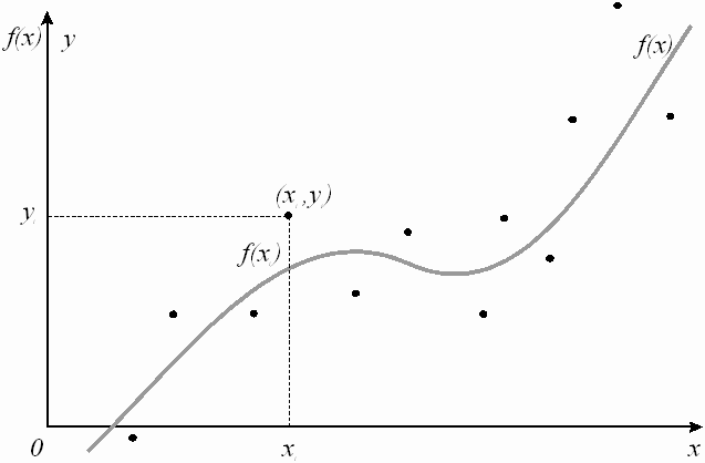 Графическая интерпретация аппроксимации. Эта функциональная (аналитическая) зависимость должна с достаточной точностью соответствовать исходной табличной зависимости. Критерием точности или достаточно "хорошего" приближения могут служить несколько условий. Обозначим через f i значение, вычисленное из функциональной зависимости для x=x i и сопоставляемое с y i . Одно из условий согласования можно записать как