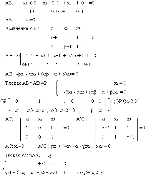 Исторический обзор аксиоматического построения проективной геометрии. Имеются различные аксиоматические способы построения проективного пространства. Наиболее распространенным является видоизменение системы аксиом, предложенной в 1899 году Гильбертом для обоснования элементарной геометрии. Проективное пространство рассматривается как совокупность элементов трех родов: точек, прямых и плоскостей, между которыми установлено основное для проективной геометрии отношение инцидентности, характеризующееся надлежащими аксиомами. Они отличаются от соответствующих групп аксиом элементарной геометрии, тем, что требуют, чтобы каждые две прямые, лежащие в одной плоскости, имели общую точку и на каждой прямой имелось, по крайней мере, три различные точки. В конкретных случаях для получения более “богатой” проективной геометрии эта совокупность аксиом дополняется аксиомами порядка и непрерывности (для действительного проективного пространства), аксиома Паппа (для проективной геометрии над коммутативными телами), Фано постулатом (для проективной геометрии над телами, характеристика которого порядка ¹ 2) и т.д. Замечательным положением проективной геометрии является принцип двойственности. Говорят, что точка и прямая (точка и плоскость, прямая и плоскость) инцидентны, если точка лежит на прямой (или прямая проходит через точку и т.д.). Тогда если верно некоторое предположение А о точках, прямых и плоскостях проективного пространства, сформулированные только в терминах инцидентности между ними, то будет верно и двойственное предложение В, которое получается из А заменой слова “точка” на слово “плоскость”, слово “плоскость” на слово “точка” и с сохранением слова прямая. Важную роль в проективной геометрии играет Дезарга предложение, выполнение которого необходимо и достаточно для введения проективными средствами системы проективных координат, составленных их элементов некоторого тела К, естественным образом связанного с точкой проективной прямой. Основы проективной геометрии заложены в 17в Ж. Дезаргом и Б. Паскалем. Большое значение для последующего развития проективной геометрии имели работы П. Монтена (2-я полов. 18в – нач. 19в). Как самостоятельная дисциплина проективная геометрия была изложена Понселе (нач. 19в). Заслуга Ж. Понселе заключается в выделении проективных свойств фигур в отдельный класс, и установлении соответствий между метрическими и проективными свойствами этих фигур. К этому же периоду относятся работы Ж. Брионшона. Дальнейшее развитие проективная геометрия получила в трудах Я. Штейнера и М. Шаля. Большую роль в развитии проективной геометрии сыграли работы К. Штаудта, в которых были намечены также контуры аксиоматического построения проективной геометрии. Все эти геометрии, стремились доказать теоремы проективной геометрии синтетическим методом, положив в основу изложенные проективные свойства фигур. Аналитическое направление в проективной геометрии было намечено работами А. Мебиуса. Влияние на развитие проективной геометрии оказали работы Н.И. Лобачевского по созданию неевклидовой геометрии, позволившие в дальнейшем А. Кэли и Ф. Клейну рассмотреть различные геометрии, систематизировать с точки зрения проективной геометрии. Развитие аналитических методов обычной проективной геометрии 