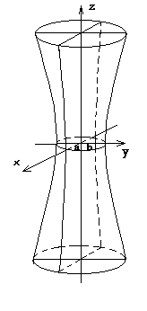 Таким образом, рассмотренные сечения позволяют изобразить однополосный гиперболоид в виде бесконечной трубки, бесконечно расширяющейся по мере удаления (по обе стороны) от плоскости Oxy. Величины a, b, c называются полуосями однополосного гиперболоида.