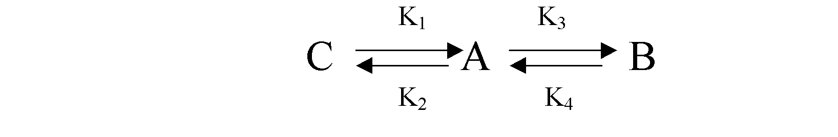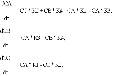 Для получения, распределения технологических параметров во времени и в пространстве (в пределах объекта), необходимо произвести СДУ методом, которых дал бы высокую точность решения при минималььных затратах времени на решение, потому что ЭВМ должна работать в режиме реального времени и успевать за ходом технологического процесса. Если время на решение задачи большое, то управляющее воздействие, выработанное на ЭВМ может привести к отрицательным воздействиям. Методов решения существует очень много. В данной работе будет рассмотрен метод решения СДУ методом Рунге-Кутта 4 порядка. Для удобства работы на ЭВМ, необходимо данную кинетическую схему преобразовать в удобный для работы на компьютере вид. Для этого необходимо кинетическую схему процесса представить в виде уравнений. При рассмотрении кинетической схемы процесса необходимо учитывать коэффициенты скоростей реакций. Но, так как процесс протекает при изотермических условиях, коэффициенты скоростей реакций можно считать за константы скоростей химической реакции. Из приведенной ниже схемы мы можем составить ряд дифференциальных уравнений, учитывающих изотермичность процесса. {2}
