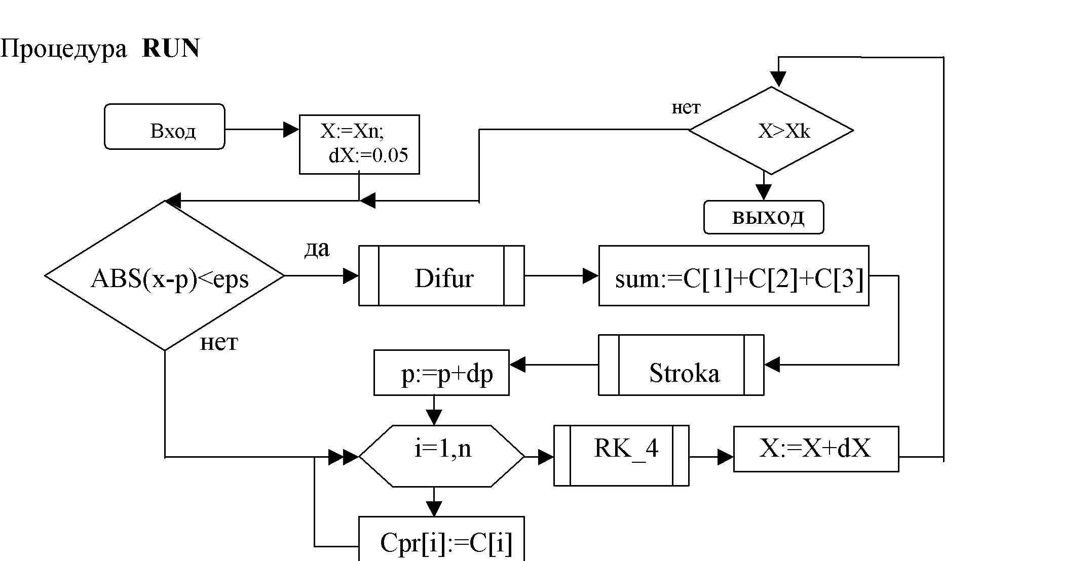 {14} В данной процедуре задействованы операторы цикла Repeat/Until , и For/Do c операторами условного перехода IF/Then . В зависимости от условий вызываются процедуры Difur и Strok. В теле цикла постоянно вызывается процедура RK-4 вызывающая 4 раза функцию Difur .