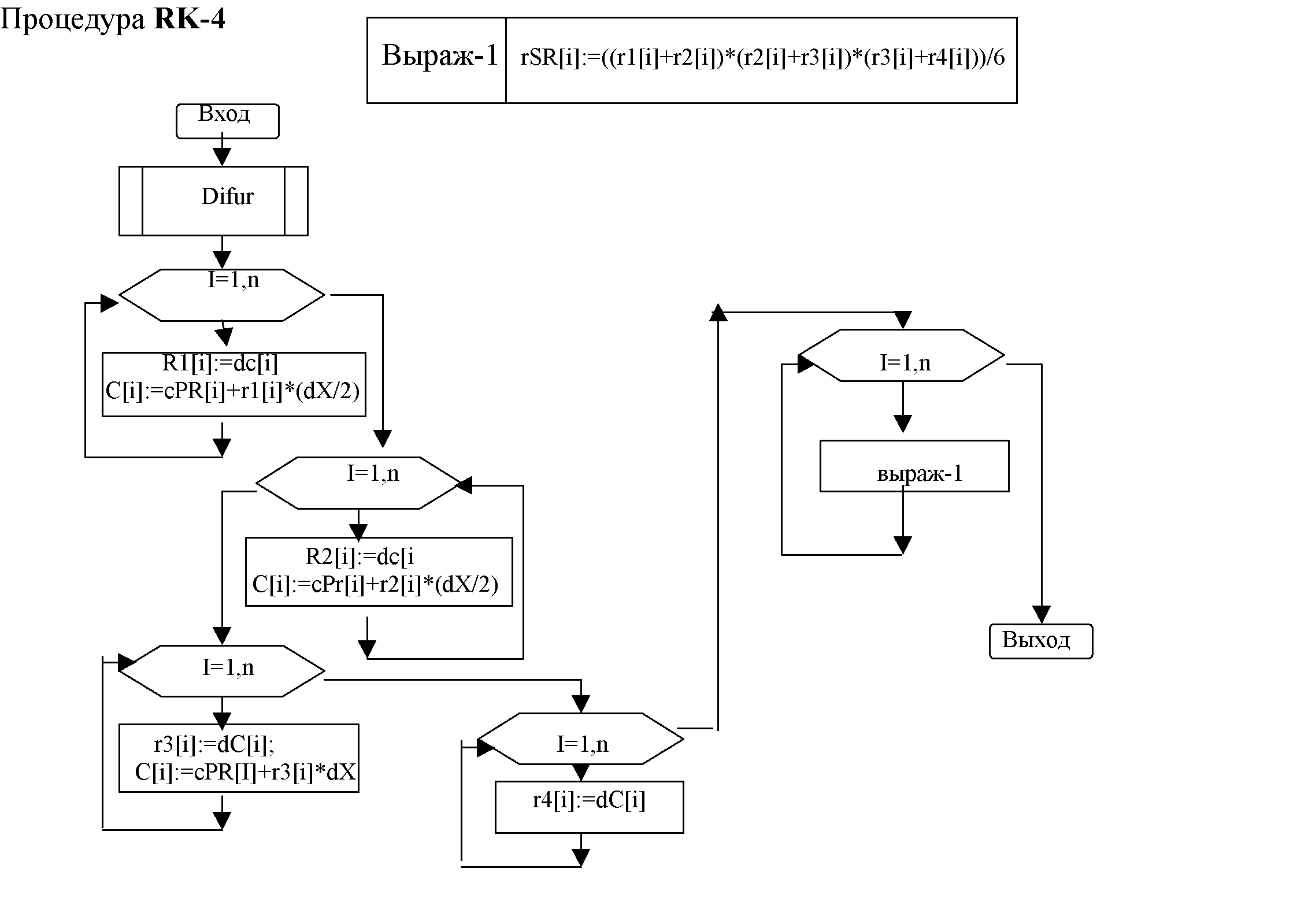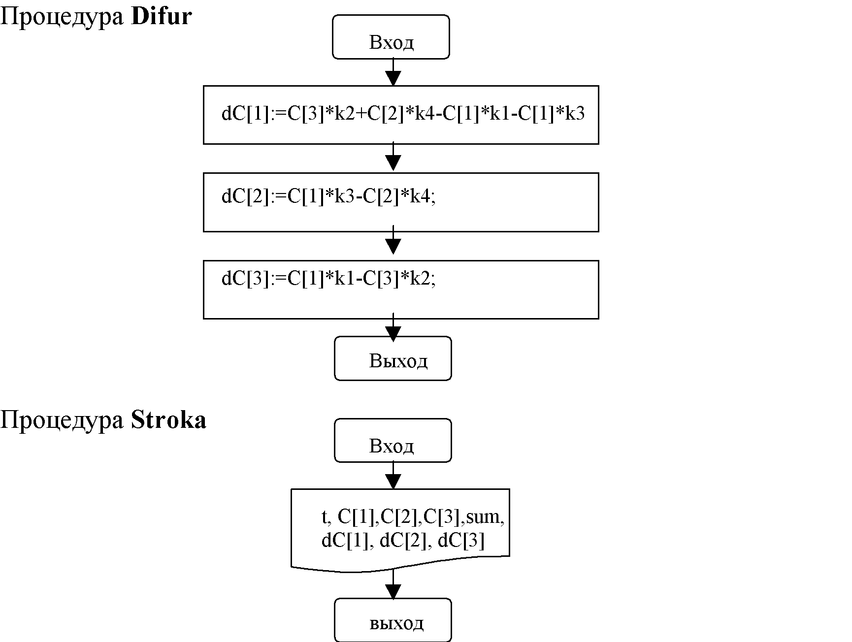 Данная процедура, используя вызовы процедур Difur , а также циклы операторы цикла FOR , вычисляет последуущие концентрации веществ по предидущим точкам.