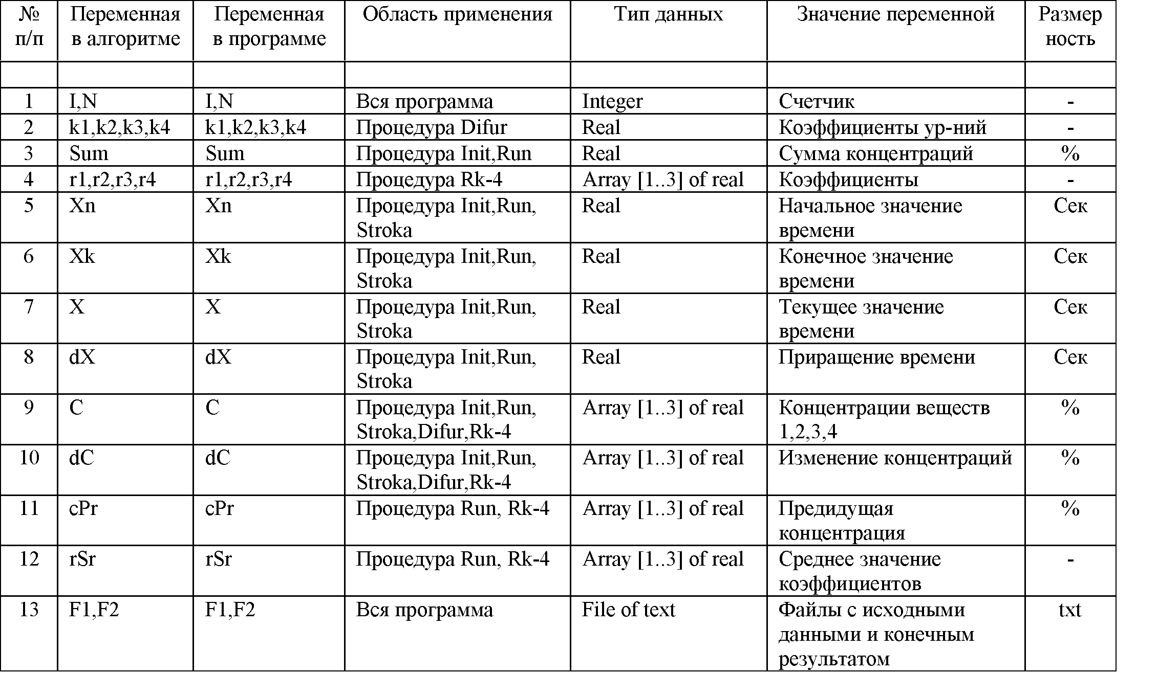 5. Программа PROGRAM smith_04;USES crt; VAR i,n:integer; sum,k1,k2,k3,k4,p,dp,eps,Xn,Xk,X,dX:real; rSR,C,dC,r1,r2,r3,r4,cPR:array[1..3] of real; f1,f2:text; PROCEDURE Difur; BEGIN dC[1]:=C[3]*k2+C[2]*k4-C[1]*k1-C[1]*k3; {dcA} dC[2]:=C[1]*k3-C[2]*k4; {dcB} dC[3]:=C[1]*k1-C[3]*k2; {dcC} END; PROCEDURE RK_4; BEGIN Difur; FOR i:=1 TO n DO BEGIN r1[i]:=dC[i]; C[i]:=cPR[i]+r1[i]*(dX/2); END; Difur; FOR i:=1 TO n DO BEGIN r2[i]:=dC[i]; C[i]:=cPr[i]+r2[i]*(dX/2); END; Difur; FOR i:=1 TO n DO BEGIN r3[i]:=dC[i]; C[i]:=cPR[I]+r3[i]*dX; END; Difur; FOR i:=1 TO n DO r4[i]:=dC[i]; FOR i:=1 TO n DO rSR[i]:=((r1[i]+r2[i])*(r2[i]+r3[i])*(r3[i]+r4[i]))/6; END; PROCEDURE STROKA; BEGIN WRITE(f2,'|',x:4:1,'|',c[1]:7:3,'|',c[2]:7:3,'|',c[3]:7:3,'|'); WRITE(f2,sum:3:0,'|',dc[1]:7:3,'|',dc[2]:7:3,'|',dc[3]:7:3,'|'); WRITELN(f2); END; PROCEDURE RUN; BEGIN WRITE('Step 3: Calculating data and writting results to file : out.rez'); X:=Xn; dX:=0.05; REPEAT IF (ABS(x-p)<eps) THEN BEGIN Difur; sum:=C[1]+C[2]+C[3]; STROKA; p:=p+dp; END; FOR i:=1 TO n DO Cpr[i]:=C[i]; RK_4; X:=X+dX; UNTIL(X>Xk); WRITELN(' - done.'); END; PROCEDURE INIT; BEGIN ClrScr; WRITELN('Smith-04: v1.0 (c) 1998 by Mike Smith smith01@home.bar.ru '); WRITELN; WRITELN; WRITE('Step 1: Read data from file : in.dat'); ASSIGN(f1,'in.dat'); RESET(f1); READLN(f1,C[1],C[2],C[3]); READLN(f1,k1,k2,k3,k4); READLN(f1,Xn,Xk,dp,n,eps,p); WRITELN(' - done.'); ASSIGN(f2,'out.rez'); REWRITE(f2); WRITE('Step 2: Write header to file : out.rez'); WRITELN(f2,'=========================================================='); WRITELN(f2,'| t,c| Ca,% | Cb,%| Cc,% | SUM | dCa | dCb | dCc |'); WRITELN(f2,'=========================================================='); WRITELN(' - done.'); END; PROCEDURE DONE; BEGIN WRITELN('Step 4: Close all files and exiting...'); CLOSE(f1); WRITELN(f2,'============================================================'); CLOSE(f2); WRITELN; END; BEGIN INIT; RUN; DONE; END. 6. Идентификация переменных {11} Таблица 1
