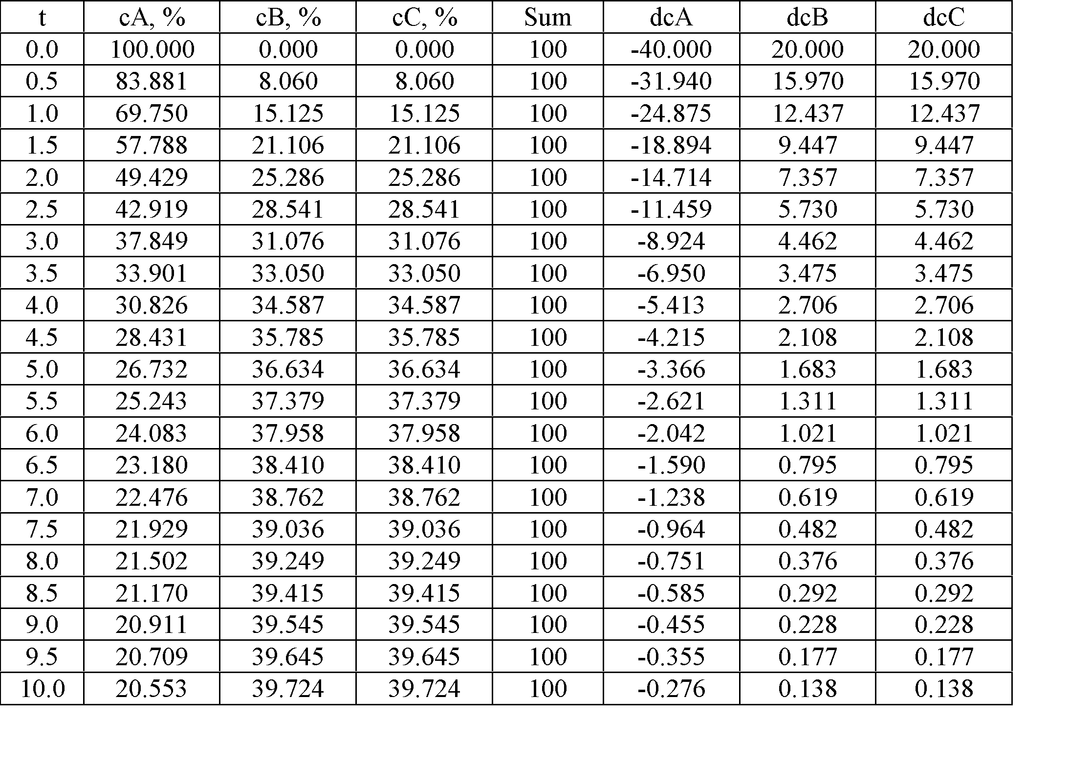 Для преобразования данных дифференциальных уравнений для использования их в расчетах тепловых и кинетических схем методами Рунге-Кутты необходимо подставлять вместо производных значений концентраций, значения концентраций данных в начале процесса. Это обусловлено тем, что метод Рунге-Кутты четвертого порядка, который будет использован для расчета кинетической схемы процесса. Так как этот метод требует сведений только об одной точке и значений функции.