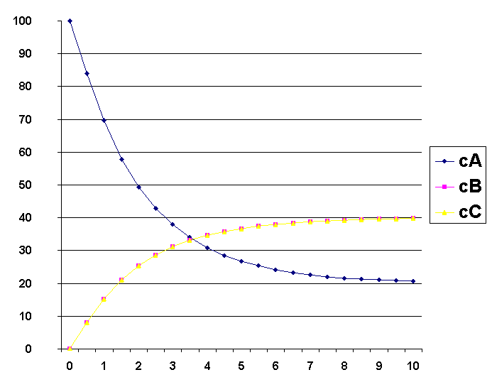 Можно сказать, что процесс протекает в сторону увеличения концентрации веществ В и С и уменьшения концентрации вещества А. Процесс будет протекать до момента установления равновесия, но в данном случае равновесие не установлено, так как вещества продолжают расходоваться и образовываться. На протяжении всего процесса ни одно из образующихся веществ не поменяло знак производной. Это говорит о том, что процесс протекает в одну сторону.