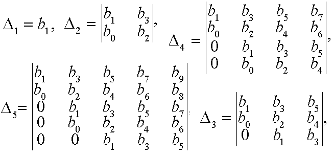 c действительными коэффициентами и b0>0 были отрицательными, необходимо и достаточно, чтобы были положительными все определители D 1, D 2, ..., D m, составленные из коэффициентов уравнения по следующей схеме :