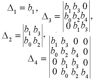 и т. д. Сформулированный алгебраический критерий устойчивости называют критерием Рауса - Гурвица. При составлении определителей по указанной схеме коэффициенты с индексом, превышающим степень характеристического уравнения заменяют нулями. Поэтому для уравнения четвертой степени получаются следующие определители :