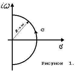 не имела полюсов в правой полуплоскости р = s + i w , т.е. в области, ограниченной полуплоскостью бесконечно большого радиуса R и осью i w (см. рисунок), равносильно условию, что знаменатель выражения (2) не должен иметь нулей в указанной области или, что то же, функция