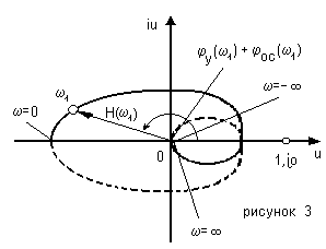 которое при ½ p ½ ® ¥ можно представить в виде (под В подразумевается постоянный коэффициент, а p 0i и p пi - соответственно нули и полюсы функции К(р)). Совершенно аналогично и функцию Н(р) при ½ p ½ ® ¥ можно представить в форме H(p) = Ap n-m где n и m - числа соответственно нулей и полюсов функции Н(р). При n < m и ½ p ½ ® ¥ модуль функции H(p) на полуокружности R ® ¥ равен нулю. Таким образом, полуокружность бесконечно большого радиуса R на плоскости р преобразуется в точку, лежащую в начале координат на плоскости Н, и для построения годографа Н в виде замкнутого контура достаточно знать поведение Н(р) на оси iw, т.е. знать АЧХ и ФЧХ цепи K y (iw),K oc (iw). Обходу контура на рисунке 1 в положительном направлении (против часовой стрелки) соответствует обход годографа Н при изменении частоты от ¥ до - ¥ , т.е. также против часовой стрелки (см. рисунок 3). Следовательно, если годограф передаточной функции разорванного кольца не охватывает точку 1,i0 , то при замкнутой цепи обратной связи система устойчива, в противном случае система неустойчива. Это условие называют критерием устойчивости Найквиста, а годограф H(iw) - диаграммой Найквиста. Показанная на рисунке 3 диаграмма соответствует устойчивой системе. Это видно из того, что годограф Н не охватывает точку 1,i0. Сплошной линией показана часть контура, соответствующая положительным частотам 0<w< ¥ , а штриховой - часть контура, соответствующая отрицательным частотам. Так как функция u(w) четная, а v(w) нечетная относительно w, то оба годографа симметричны относительно действительной оси. Рисунок 3 был построен для случая, когда при w = 0 передаточная функция Н(iw) отлична от нуля ( эта возможно, например, для усилителей постоянного тока, в которых отсутствуют разделительные конденсаторы). Основное преимущество данного метода : удобство оперирования с АЧХ и ФЧХ разомкнутой цепи. Следует отметить, что при сложной схеме устройства форма диаграммы бывает настолько усложнена, что по ней сложно судить о попадании точки 1,i0 в замкнутый контур годографа. В подобных случаях оказывается полезным критерий, вытекающий из критерия Найквиста, основанный на подсчете числа пересечений годографом оси U н (w) на участке 1, ¥ . Для устойчивости системы тогда необходимо, чтобы годограф либо вообще не пересекал этот отрезок, либо пересекал его в положительном и отрицательном направлениях одинаковое число раз.