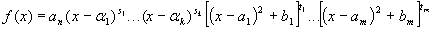 Пусть deg f(x)>1 , тогда по основной теореме алгебры он обладает корнем. Пусть таким корнем будет х=а . По следствию из теоремы Безу: f(x)=(x-a)f 1 (x) . Так как deg(x-a)=1, degf(x)>1, deg(x-a)f 1 (x)=deg(x-a)+degf 1 (x) , то degf(x)>0 ; то есть f(x) – приводим, что противоречит условию. Таким образом, неприводимым над полем С является только многочлен первой степени. Следствие 4 . Если f(x)О C[x], degf(x)=nі 1 , то его можно представить в виде: с(x-a 1 )(x-a 2 )...(x-a n ), (*) где a i – корни его, а сО С.