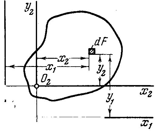(2) Через х и у обозначены текущие координаты элементарной площадки dF в произвольно взятой системе координат х, y . Первые два интеграла называются осевыми моментами инерции сечения относительно осей х и y соответственно. Третий интеграл называется центробежным моментом инерции сечения относительно осей х, у. Размерность моментов инерции см 4 . Осевые моменты инерции всегда положительны, поскольку положительной считается площадь dF. Центробежный момент инерции может быть как положительным, так и отрицательным, в зависимости от расположения сечения относительно осей х, у. Выведем формулы преобразования моментов инерции при параллельном переносе осей. Будем считать, что нам заданы моменты инерции и статические моменты относительно осей х 1 и y 1 . Требуется определить моменты инерции относительно осей x 2 и y 2