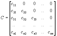 Уравнение (7) можно записать в следующем виде: CBx=b. (9) Произведение Bx матрицы B на вектор-столбец x является вектором-столбцом, который обозначим через y: Bx=y. (10) Тогда уравнение (9) перепишем в виде: Cy=b. (11) Здесь элементы с ij известны, так как матрица А системы (7) считается уже разложенной на произведение двух треугольных матриц С и В. Перемножив матрицы в левой части равенства (11), получаем систему уравнений из которой получаем следующие формулы для определения неизвестных: