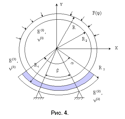 Данная задача часто возникает на практике при транспортировке или хранении с горизонтальным расположением оси оболочечные конструкции устанавливаются на круговые опоры - ложементы. Взаимодействие подкрепленных оболочечных конструкций и ложементов осуществляется через опорные шпангоуты, протяженность которых вдоль оси оболочки соизмерима с шириной ложементов и много меньше радиуса оболочки и величины зоны контакта.