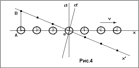 Часы здесь синхронизированы так, как того требует теория относительности. Здесь "с" - скорость электромагнитных волн, объединяющих систему. Такую картину видел бы в момент времени t = 0 наблюдатель, находящийся вне среды и наблюдающий за системой с помощью обычного, не замедленного света и без ошибки наблюдения. Можно также считать, что движется здесь среда (влево), а элементы неподвижны. Картина от этого не меняется. Часы показывают состояние (фазы) процессов, и по ним определяется Лоренцево "местное время". Каждый последующий в движении процесс опережает в своем течении предыдущего, что и показывают эти часы. Те же элементы (точнее, процессы в них) показаны в плоскости (Х,ct) точками, лежащими на оси X'. Их координаты по оси времени ct соответствуют показаниям часов. Отрезок oA соответствует расстоянию элемента A от начала координат (от элемента "o") в трехмерном пространстве, отрезок AB - временному интервалу между процессами в них. Расстояние между элементами в системе (или между часами) и временной интервал между ними, взятые вместе, составляют четырехмерный пространственно-временной интервал (отрезок oB), длина которого в четырех измерениях (в пространстве и времени) определяется как гипотенуза треугольника, катетами которого служат расстояние (трехмерная длина oA) и произведение временного интервала на скорость электромагнитных волн в среде (AB). Ось ct' (график движения элемента "о") служит осью времени системы координат (X',ct'), которая движется вместе с элементами. С точки зрения наблюдателя, неподвижного относительно нее и способного наблюдать за ней лишь с помощью тех же медленных волн, все часы показывают одинаково. Разницы в их показаниях он не видит. Это полностью скрыто от него за ошибкой наблюдения. Изображение системы координат на рис.4 выглядит непривычно лишь потому, что точками на оси Х' показано не время, определяемое по местным часам, а состояния самих этих часов, т.е. та же величина с обратным знаком. Пространственно-временной интервал (длина в четырехмерном пространстве-времени) от скорости системы в среде не зависит. С увеличением скорости уменьшаются расстояния между элементами системы, но временные интервалы между ними увеличиваются так, что длины пространственно-временных сохраняются. Расстояние между часами, первоначально равное l, при скорости v становится равным l/g , и образуется временной интервал, равный lv/с 2 . Квадрат длины гипотенузы треугольника, катеты которого равны l/g и c(lv/с 2 ), равен: (1 - v 2 /с 2 )× l 2 + (lv/c) 2 = l 2 , т.е. длина гипотенузы при любой скорости равна ее длине при v=0. Вот это постоянство четырехмерной длины и утверждается постулатом теории относительности о постоянстве размеров тел. Размеров не в обычном смысле, не в трех измерениях, а в четырех. Постулат не относится к длине трехмерной, равной l/g. И не позволяйте критикам путать, как они обычно путают, длину трехмерного отрезка, от скорости зависящую, с четырехмерной “длиной” пространственно-временного интервала, от скорости не зависящей. Не позволяйте им также называть длиной пространственно-временной интервал. Эти две величины различаются принципиально, как килограмм массы от килограмма силы. Именно такую путаницу применяют для критики Лоренца и Фицджеральда, пользуясь всеобщим недопониманием. Так классическая физика объясняет фундаментальный пос