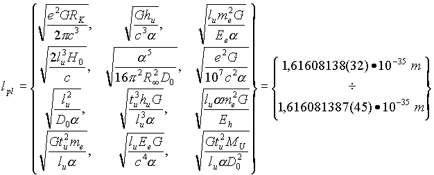 Все расчетные значения планковских единиц, полученные по новым формулам, чрезвычайно близки между собой. Все они на несколько порядков точнее значений, рекомендованных и CODATA 1986, и CODATA 1998. Совершенно очевидно, что каждая группа формул должна давать одинаковые значения констант l pl , t pl , m pl . Сближение расчетных значений, полученных по приведенным формулам, будет происходить по мере уточнения значений фундаментальных физических констант. Соотношения вида: l pl =(l u 2 /D o α) 1/2 =(2l u 3 H 0 /c) 1/2 =Gt u 2 m e /l u α) 1/2 =(Gh u /c 3 α) 1/2 =(α 5 /16π 2 R ∞ 2 D o ) 1/2 =(t u 3 h u G/l u 3 α) 1/2 = (l u E e G/c 4 α) 1/2 = (l u m e 2 G/E e α) 1/2 =(e 2 G/c 2 10 7 α) 1/2 =l u m e /m pl α=(l u αm e 2 G/E h ) 1/2 =(Gt u 2 M U /D 0 2 l u α) 1/2 , t pl =(t u 2 /D o α) 1/2 =(2t u 3 H 0 ) 1/2 =(Gt u m e /c 3 α) 1/2 =(Gh u /c 5 α) 1/2 =(α 5 /c 2 16π 2 R ∞ 2 D o ) 1/2 =(t u 5 h u G/l u 5 α) 1/2 =(l u E e G/c 6 α) 1/2 = (l u m e 2 G/c 2 E e α) 1/2 =(e 2 G/c 4 10 7 α) 1/2 =(l u αm e 2 G/c 2 E h ) 1/2 =(Gt u 4 M U /D 0 2 l u 3 α) 1/2 =(e 2 GR K /2πc 5 ) 1/2 , m pl =h u t u (D o /α) 1/2 /l u 2 =m e D o (t u •2 H 0 ) 1/2 =m e (D o /α) 1/2 = =(c 2 l u /G) (1/D o α) 1/2 =(E e l u /Gα) 1/2 =(2μ B /l u ) (α•10 -7 /G) 1/2 = (2h u l u D o H 0 /G) 1/2 =(2H 0 cl u 2 /G) (αD 0 ) 1/2 =M U (1/D o 3 α) 1/2 = (E e α 2 /4πR ∞ G) 1/2 можно использовать для согласования значений большого количества физических и астрофизических констант. ВЫВОДЫ