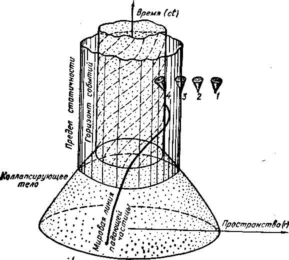 Рис. 2. Диаграмма пространства-времени при сферическом ' коллапсе. Достаточно массивное тело с течением времени : сжимается под действием сил тяготения, пересекает горизонт Событий и в конце концов сжимается в точку. Цифрами обозначены локальные световые конуса. Сигнал из точек 1 и 2 может дойти до внешнего наблюдателя, из точек 3 и 4, т. е. из-под гравитационного радиуса, не может