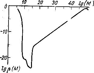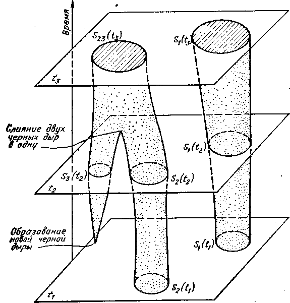 Рис. 5. Возможные процессы с черными дырами. Иллюстрация к теореме Хокинга. Плоскости t1, t2, t 3 обозначают пространственные сечения в соответствующие моменты времени, S 0 (t l ) — площадь черной дыры о в момент времени t i . Две черные дыры могут сливаться в одну, черные дыры могут возникать, площадь поверхности одиночной черной дыры возрастает со временем. Одна черная дыра не может распасться на две или более черных дыр. Теорема Хокинга утверждает, что общая площадь поверхностей черных дыр в момент ( является неубывающей функцией времени теорема была доказана им при самых широких предположениях, среди которых наиболее существенным является предположение о положительности плотности энергии вещества и физических полей, с которыми взаимодействует черная дыра. Это предположение, безусловно справедливое в рамках классической физики, мо- жет, однако, нарушаться при учете квантовых эффектов, Доказательство этой теоремы основано на том, что падение в черную дыру вещества и поля, плотность энергии которых положительна, приводит к возрастанию энергии черной дыры, а следовательно, и площади ее поверхности. Для невращающейся незаряженной черной дыры в этом легко убедиться, используя связь между массой М и площадью поверхности А : А = = 16pi(GM/c 2 ) 2 , Обратный процесс извлечения вещества и энергии из-под горизонта событий невозможен. Теорема Хокинга справедлива и в более общем случае, когда имеется несколько черных дыр. При их взаимодействии сумма площадей поверхностей черных дыр не уменьшается со временем. Используя эту теорему, удается, в частности, доказать, что одиночная черная дыра не может распасться на две меньшие черные дыры. Для того чтобы убедиться в этом, предположим сначала, что процесс распада черной дыры с массой М, угловым моментом J и зарядом Q возможен, и в результате этого процесса образуются две далеко отстоящие друг от друга черные дыры с массами М1 и М 2 , угловыми моментами J1 и J2 и зарядами Q1 и q2. В соответствии с .законами сохранения энергии и электрического заряда Q = Q1 + Q2, M>=M1+M2 Неравенство возникает из-за того, что часть энергии при распаде может быть унесена гравитационным, а при наличии заряда — и электромагнитным излучением. Это излучение может унести также полный угловой момент или часть его. Можно убедиться, что эти соотношения противоречат условию возрастания площади поверхности черных дыр: A1+A 2 >=A. Обратный процесс слияния двух черных дыр возможен. Этот процесс может сопровождаться излучением гравитационных волн. Если при слиянии черных дыр с массами М1 и М 2 образуется дыра с массой М, то уносимая излучением доля энергии epsilon =(M1 + M 2 —M)/(M1+ M 2 ) не превосходит величины 1—2 -3/2 = 0,64647... Если заряды этих дыр равны нулю или имеют одинаковый знак, то epsilon<1/2- Если к тому же черные дыры не вращаются и J1 = J 2 = 0, то epsilon< 1 —2 -2/2 = 0,2929... ЭВОЛЮЦИЯ ЗВЕЗД И ЧЕРНЫЕ ДЫРЫ Возможен ли коллапс малых масс? Прервем на время рассказ об удивительных свойствах черных дыр, чтобы ответить на неизбежный вопрос: “А какие есть основания считать, что черные дыры действительно существуют в природе?” Для того чтобы тело с массой М образовало черную дыру, необходимо сжать его до размера порядка гравитационного радиуса, при этом плотность окажется порядка р{ро}~M/(4/3piR 3 g )=Зс 6 /(32piG 3 М 2 )~7,3-10 82 M -2 г/см 3 (М — масса в граммах). Еще задолго до достижения таких плотностей возни