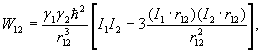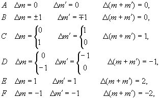 Прежде всего, рассмотрим несколько подробнее взаимодействие между двумя спинами, которые будем обозначать для краткости i и i’. Пусть q и j — полярные координаты вектора r, описывающего их взаимное положение, причем ось z направлена параллельно внешнему полю. Тогда W ii можно записать в виде W ii ' = { iЧ i' — 3[ i z cos q + sin q ( i x cos j + i y sin j )]x[ i' z cos q + sin q ( i' x cos y + + i' y sinj )]}g 2 ħ 2 /r 3 = { iЧ i' — 3[ i z cos q + sin q ( i + e - ij + i - e ij )/2]x[ i' z cos q + sin q ( i + e - ij + + i - e ij )/2)]}g 2 ħ 2 /r 3 = (A+B+C+D+E+F)g 2 ħ 2 /r 3 , (17) где A = i' z i z (l – 3cos 2 q ), B = – (l – 3cos 2 q ) (i + i' – + i – i' + ) = (l – 3cos 2 q )(i z i' z – iЧ i' )/2, C = – 3sinq cosq e - ij (i z i' + + i + i' z )/2, (18) D = С* = – 3sinq cosq e ij (i z i' – + i – i' z )/2, E = – 3sin 2 q e -2 ij i + i' + /4, F = E* = – 3sin 2 q e -2 ij i – i' – /4,. Запись W в такой форме вызвана следующими причинами. Согласно формуле (14), c ў ў ( w ) ~ S ў | < п | M x | n’ >| 2 . Это приводит к необходимости определить изменение в положении энергетических уровней, отвечающих ħ H 0 , обусловленное наличием ħ H 1 . Операторы А, В, С, D, E, F дают качественно различным вклады в это изменение. Упомянутые операторы, действуя на состояние невозмущенного гамильтониана, характеризующееся значениями i z =т , i ' z =т', приводят к следующему изменению этого состояния: