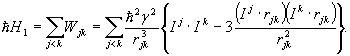 § 3. ДИПОЛЬ-ДИПОЛЬНОЕ ВЗАИМОДЕЙСТВИЕ Полный гамильтониан системы одинаковых взаимодействующих спинов в сильном внешнем поле может быть записан в виде ħ H = ħ( H 0 + H 1 ). (16) Основной гамильтониан ħ H 0 = S j Z j = – g ħ H 0 S j I j z (16a) описывает энергетические уровни, определяемые выражением ħE 0 M = – g ħ Н 0 M , где M — собственное значение оператора I z = S j I j z Гамильтониан возмущения ħ H 1 , ответственный за уширение, имеет вид